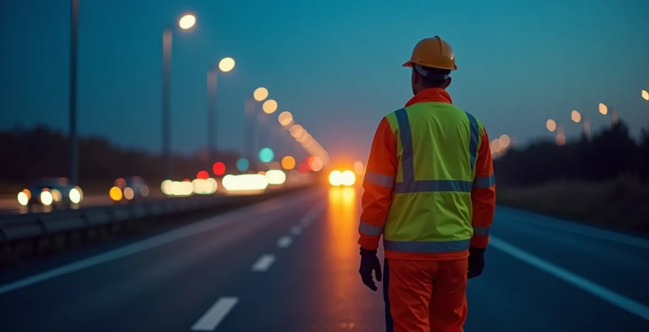 La sécurité d’un chantier nocturne sur autoroute ne repose pas uniquement sur la protection individuelle. Elle commence bien avant, avec la signalisation temporaire. Un vêtement de Classe 3, aussi performant soit-il, ne sert à rien si un conducteur surpris n’a pas le temps de ralentir. Le panneau de danger AK5 (signalant des travaux) est le premier rempart, mais son efficacité dépend crucialement de son positionnement.