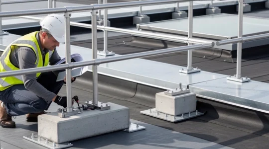 Les chutes de hauteur représentent la première cause de décès sur les chantiers du bâtiment. Les garde-corps autoportants permettent de sécuriser les toitures-terrasses sans percer l’étanchéité, grâce à un système de lestage calculé selon la zone de vent. Les pinces dalle assurent une protection périphérique rapide sur les planchers bruts, à condition de respecter un espacement maximal de 2 mètres entre chaque pince pour garantir la rigidité de l’ensemble.
