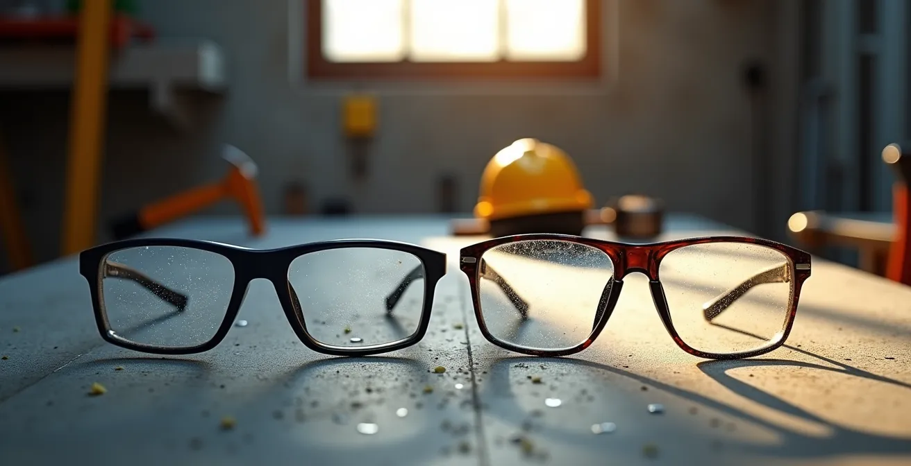 La différence fondamentale ne réside pas dans la correction, mais dans le matériau. Les lunettes de sécurité certifiées EN166 sont fabriquées en polycarbonate, un thermoplastique ultra-résistant. En cas d’impact, il se déforme pour absorber l’énergie. À l’inverse, la majorité des verres de vue sont en matière organique (type CR-39), qui se brise sous un choc bien moins violent, projetant des fragments coupants directement vers l’œil. La « protection » devient alors la source même de la blessure.