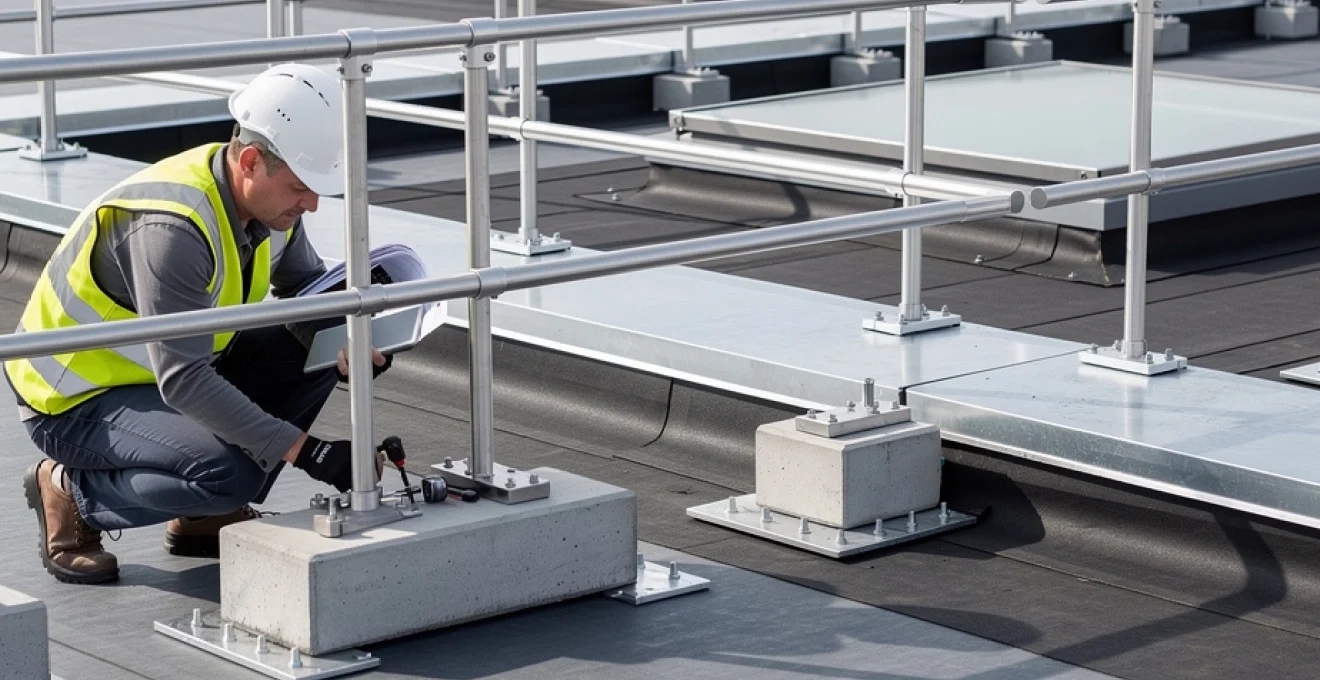 Les contrôles périodiques obligatoires doivent être définis en fonction de l’intensité d’utilisation et de l’environnement. Sur un site industriel exposé aux atmosphères corrosives, une inspection annuelle — voire semestrielle — peut s’imposer. Sur une toiture de bureau peu fréquentée, un contrôle tous les deux ans peut suffire, à condition d’effectuer des vérifications visuelles plus fréquentes. Les points à examiner sont toujours les mêmes : état des poteaux et des lisses, corrosion éventuelle, jeux anormaux dans les assemblages, fissures ou déformations, stabilité du lestage, intégrité des membranes d’étanchéité sous les platines.